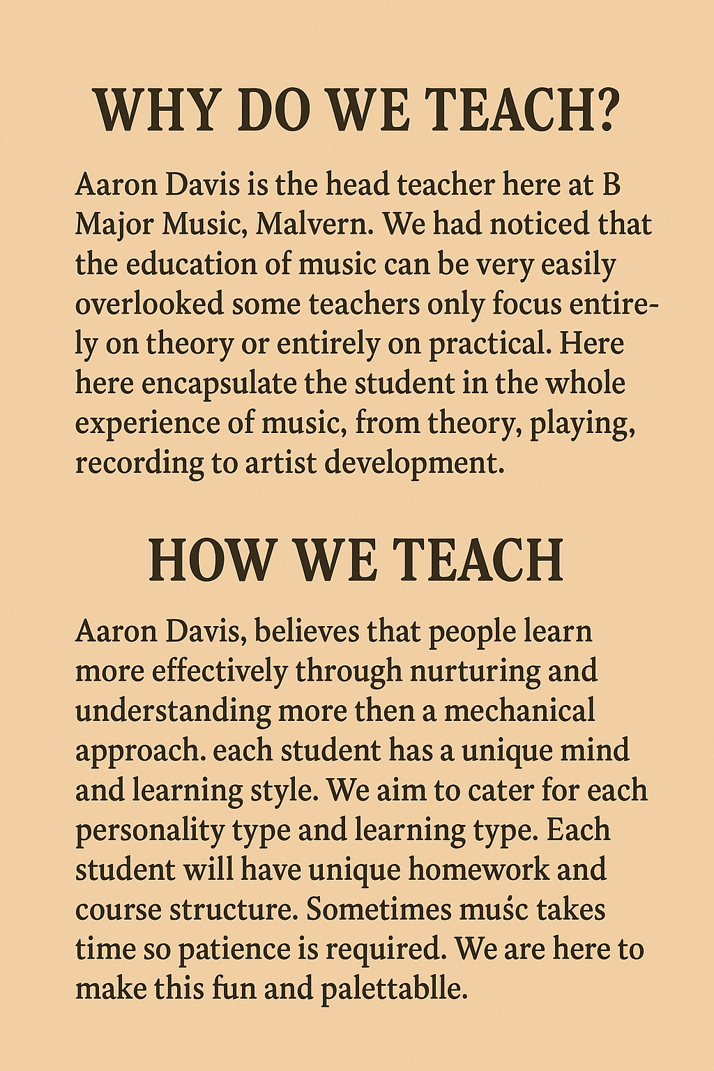 B Major Music, Malvern. Is a new family ran and operated school that was established in 2025. We might be the new kids on the block but don't let that deter you, we have over 20 years of playing/production experience and over 10 years of performance experience. With a proven history of teaching and results that match.